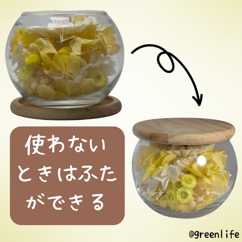 受け皿(木製)は、香りをお楽しみいただくための蓋としてもご利用いただけますので、香りを楽しむ時だけ開けてお使いいただけます。