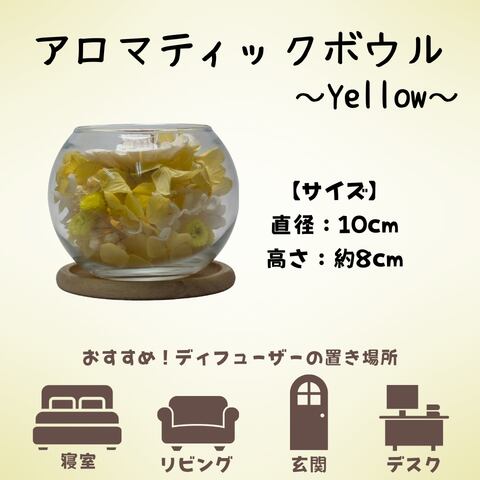 アロマティックボウル ~Yellow~は、鮮やかなイエローのデザインにドライフラワーを贅沢に使用したフラワーディフューザーです。