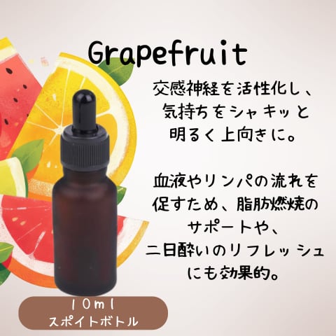 グレープフルーツは交感神経を活性化し、気持ちをシャキッと明るく上向きにしてくれます。血液やリンパの流れを促すため、脂肪燃焼のサポートや、二日酔いのリフレッシュにも効果的です。