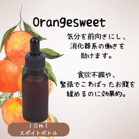 オレンジスイートは気分を前向きにし、消化器系の働きを助けます。食欲不振や、緊張でこわばったお腹を緩めるのに効果的です。
