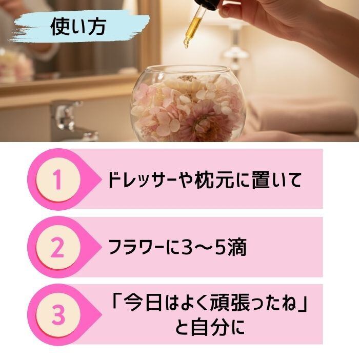 ・夜のスキンケアの仕上げに: 香りに包まれながら、自分を労わる美容時間に。