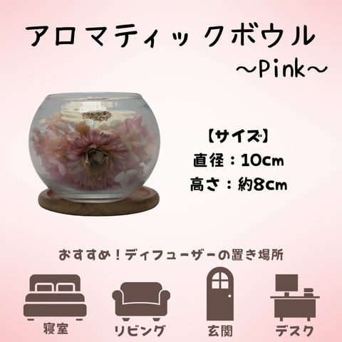 アロマティックボウル ~Pink~は、可愛らしい淡いピンクのデザインにドライフラワーを贅沢に使用したフラワーディフューザーです。