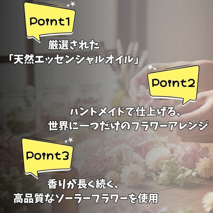 ・ドライフラワーは天然素材のため、ロットや季節・天候により色調や香りが異なる場合があります。また、環境等により変化が生じることがありますが、品質に問題はありません。