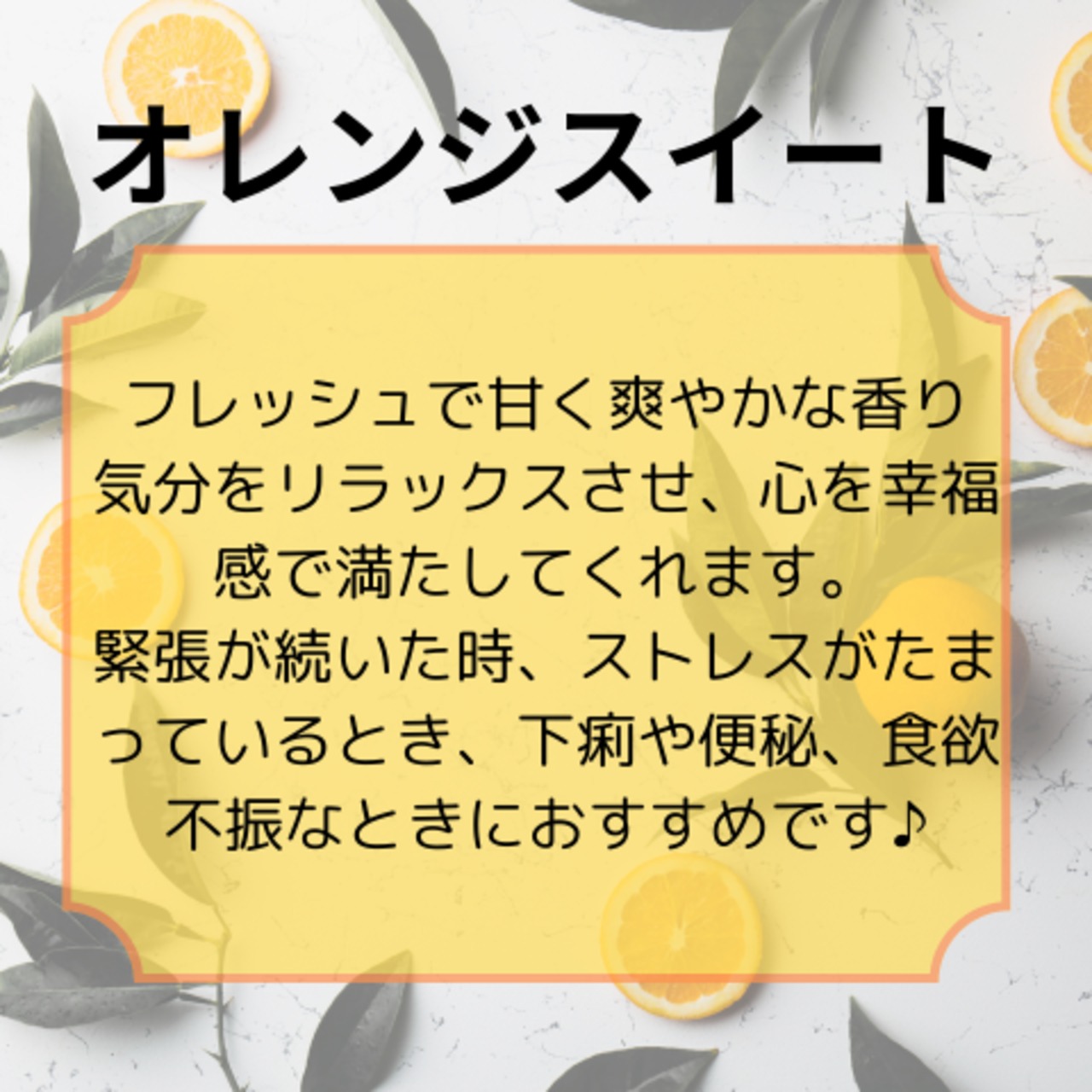 オレンジスイートは、心地よい甘さとフレッシュさが魅力のエッセンシャルオイルです。